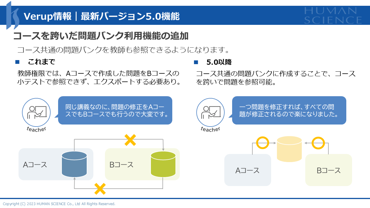 5.0では、共通の問題バンクを作成して問題を登録すれば、各コースから参照するだけで利用できるようになります。問題の一元管理が可能になり、修正も1箇所で行えば全コースに自動的に反映されます。年間で数百問もの問題を管理している教師にとって、作業時間の大幅な削減につながるでしょう。