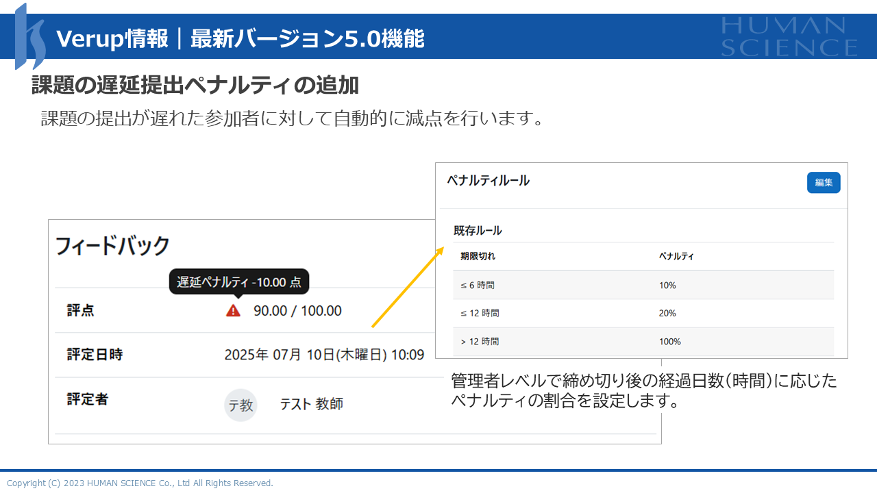 5.0では、サイト管理者が減点率などの基本ルールを設定し、教師が課題作成時に「ペナルティを適用する」を選択するだけで、システムが自動的に減点を計算します。採点時には既に減点が反映された状態で表示されるため、教師の手間が大幅に削減できます。