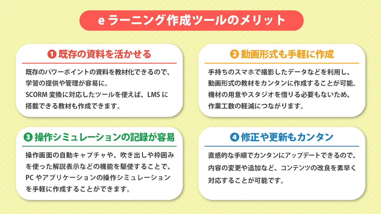 eラーニング作成ツールを利用するメリットを以下にまとめました。
