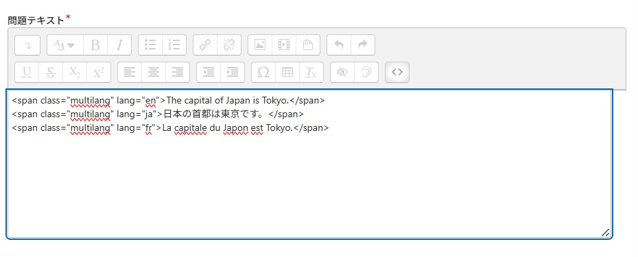 例えば、英語、日本語、フランス語でコンテンツを表示したい場合は、専用の記述方式によってテキストを入力すると、設定された言語に応じて該当言語が表示されるようになります。作成者の意図が反映された翻訳が表示されるため、重要な教育コンテンツの場合には、非常に有用な使い方ができます。