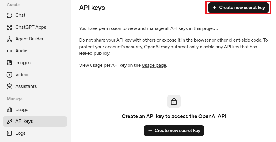 ① Access the OpenAI API key issuance page (https://platform.openai.com/api-keys).