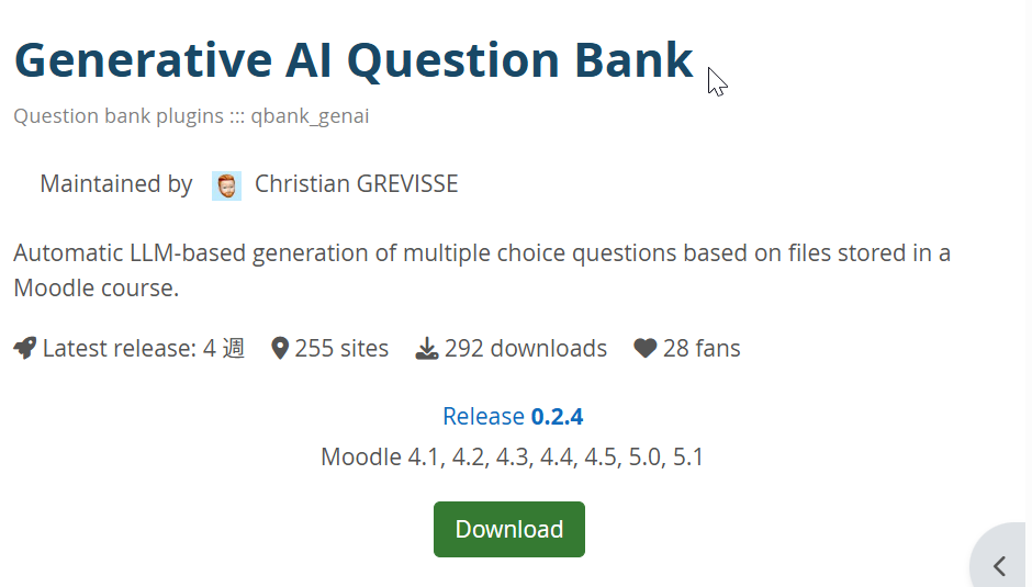 Here, we will introduce AI-related plugins from the Moodle plugin directory that have a high number of downloads. *Please install the plugins introduced here at your own risk. Our company assumes no responsibility for any issues that may arise from their use.