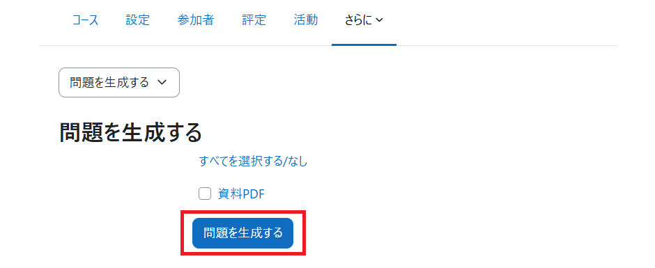 After installing from the plugin list and configuring it, a menu called "Generate Questions" will be added under "More" on the course page. Select the materials uploaded to the course, click the "Generate Questions" button, and wait.