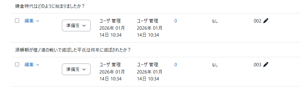 A dedicated category was added, and 10 questions were generated. In the image below, you can see multiple-choice questions generated based on text materials about the Kamakura period, such as "How did the Kamakura period begin?" and "In what year was the Taira clan defeated?"
